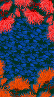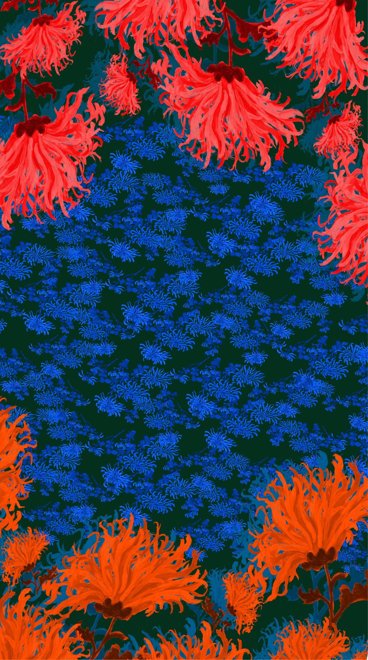 Un conjunto de crisantemos, en primer plano y pintados en tono sobre tono, se representan sobre un fondo monocromo de las misma flores.