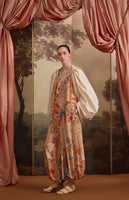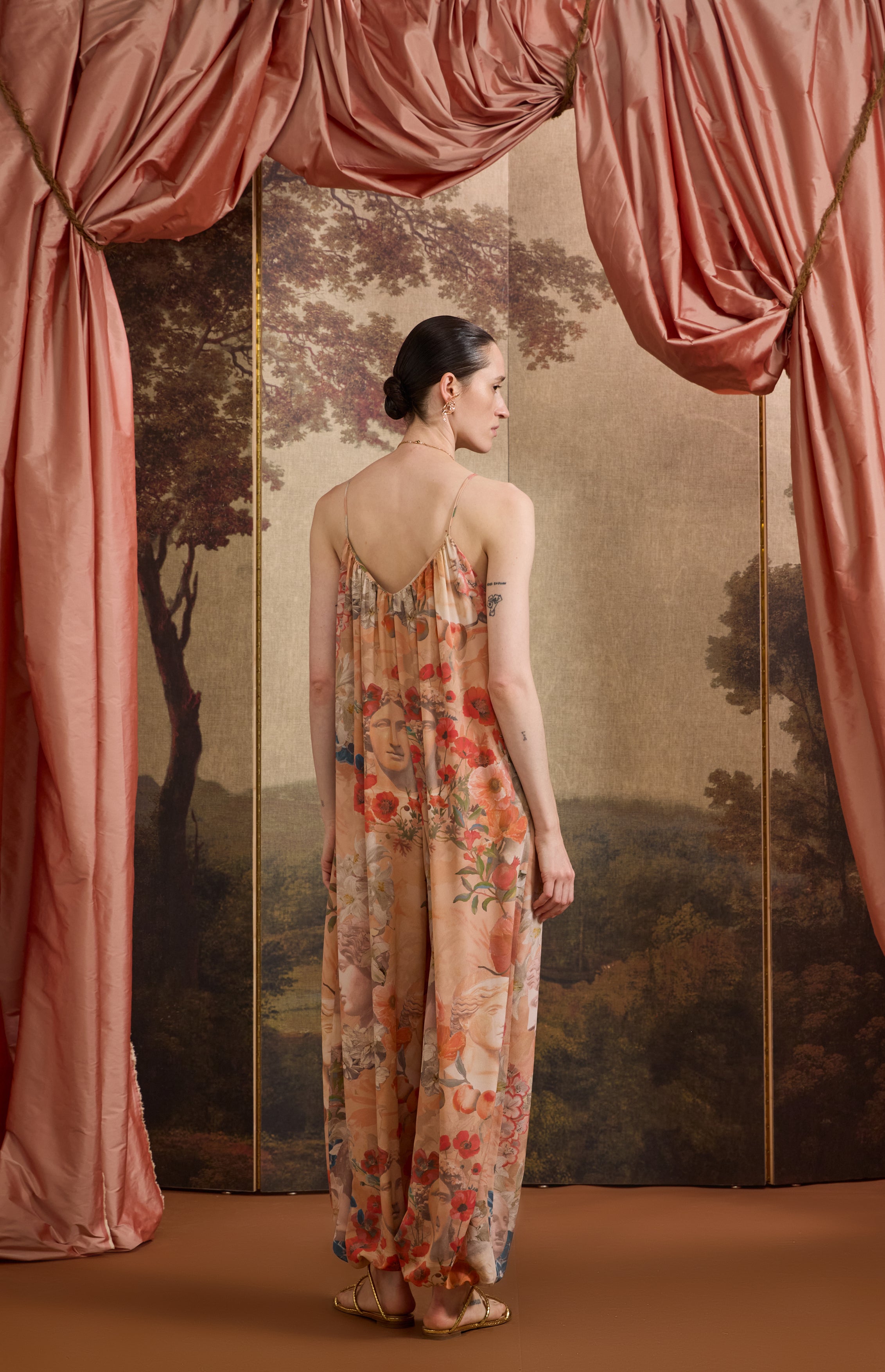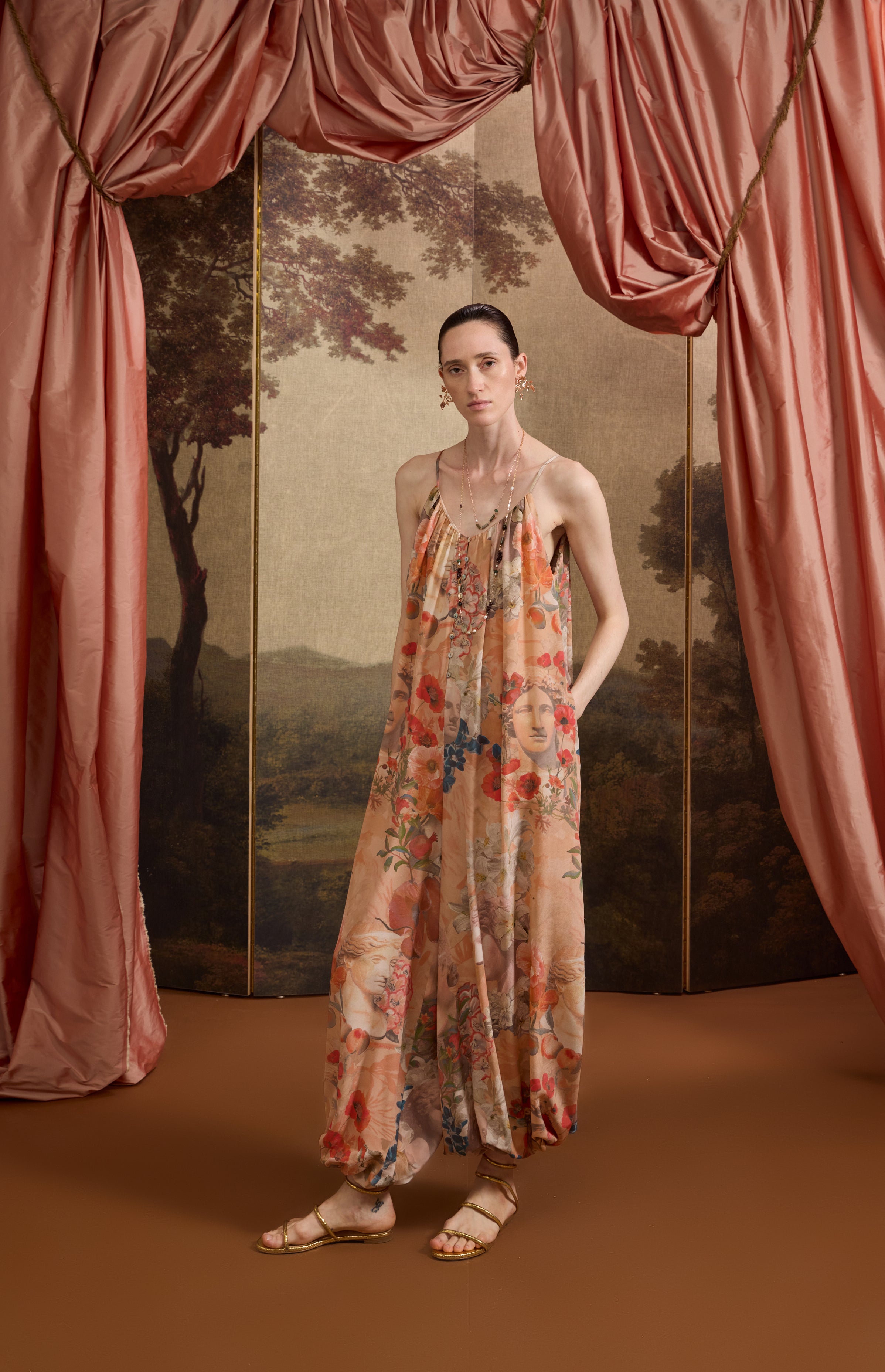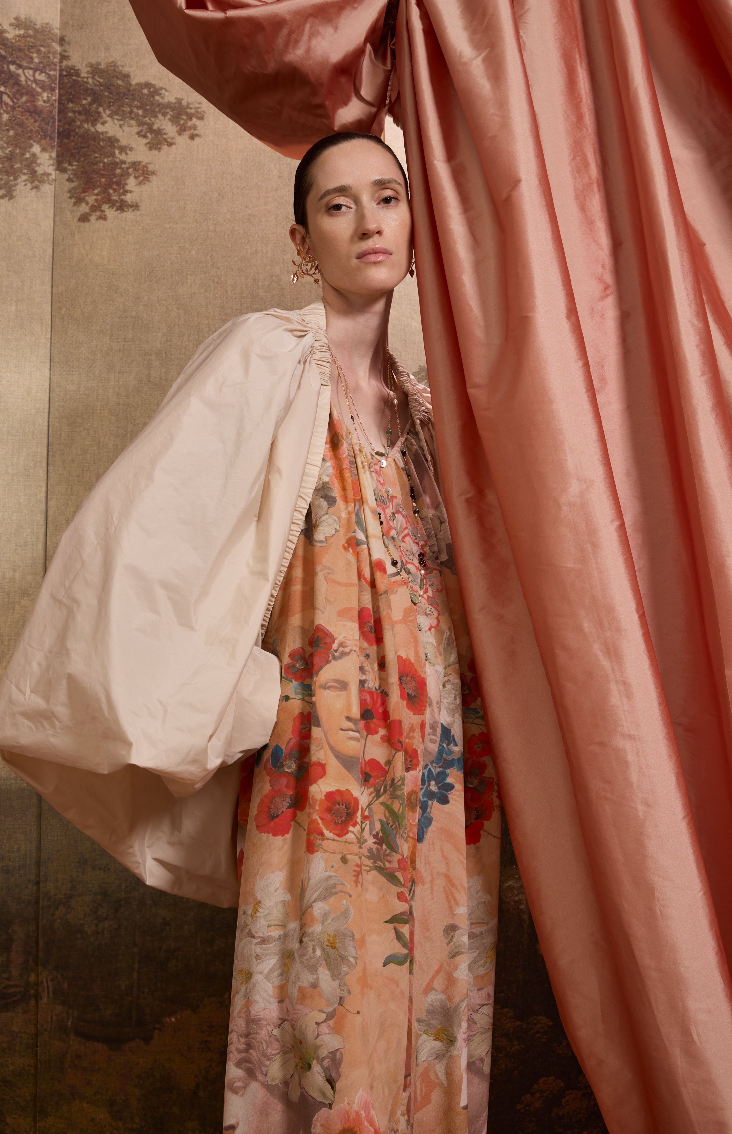 El estampado "Flores y bustos" es un original dibujado con lápices de pastel y sanguinas. Una amalgama de bustos de mármol con amapolas, lirios fragantes  y granadas carmesí.